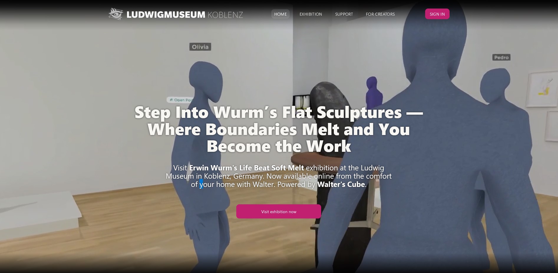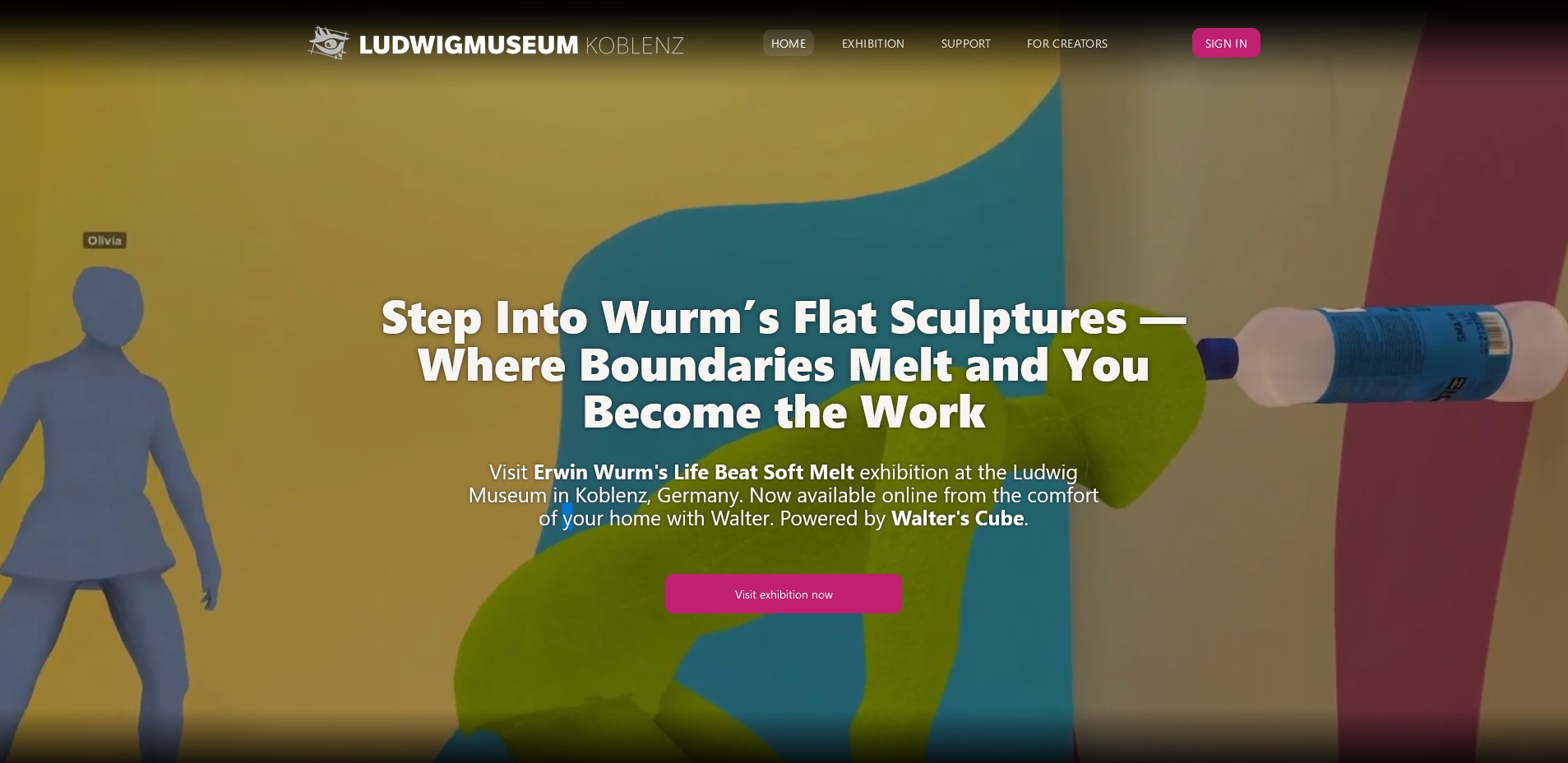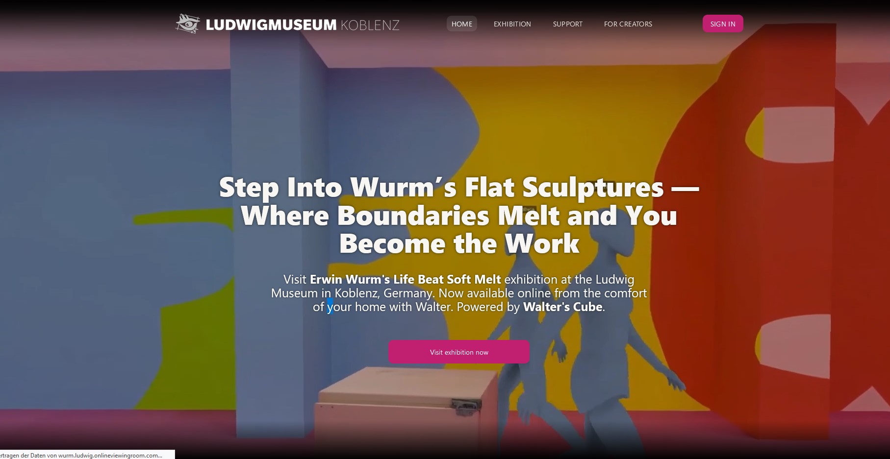 Die von Beate Reifenscheid und Jérôme Sans kuratierte Ausstellung verwandelte das Museum in das, was Sans als „physisches Metaversum“ bezeichnet: Wurms monumentale Flat Sculptures verwandelten Wände und Decken in eine immersive gemalte Architektur, in der verzerrte Wörter – LIFE, BEAT, SOFT, MELT – nur durch Körperbewegungen zu erkennen sind. Als die physische Ausstellung endete, stellten Sans und Reifenscheid die Frage: Warum dieses Experiment beenden? In Zusammenarbeit mit Walter’s Cube wandert die Ausstellung nun in den digitalen Raum – nicht nur als Dokumentation, sondern als neues Kapitel, in dem Skulptur, Interaktion und Architektur online zusammenfließen.